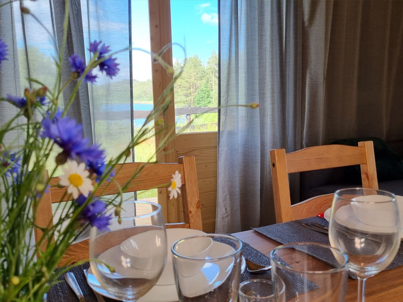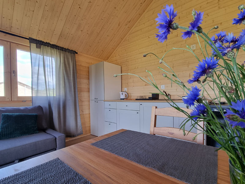 Domek ma powierzchnię 24 m² i składa się z dużego salonu z aneksem kuchennym, wygodnej sypialni i łazienki urządzonej w nowoczesnym stylu w nawiązaniu do tradycyjnej kaszubskiej kolorystyki bieli, czerni i drewna. Każdy z domków jest przystosowany do pobytu 4 osób.